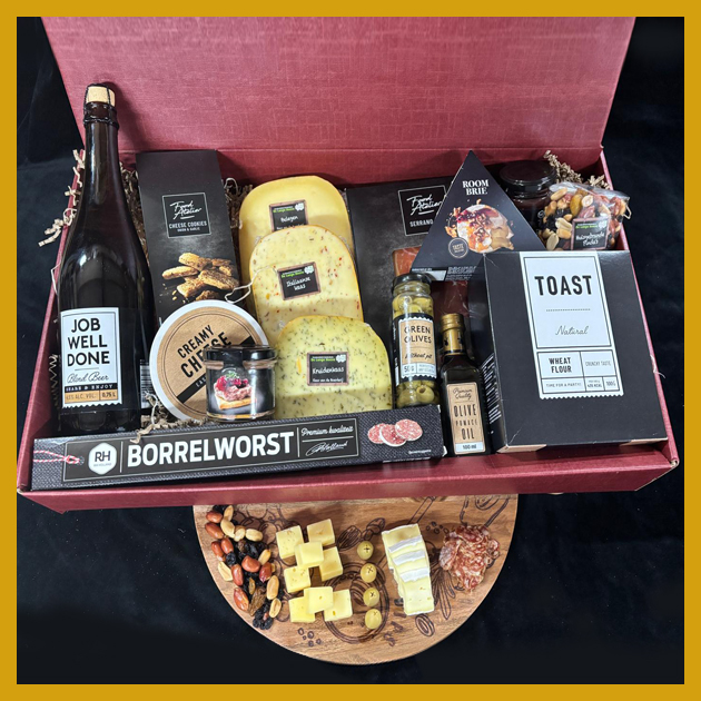 Inhoud: met veel streekproducten, zoals kaas, noten, worst en vruchtensap.