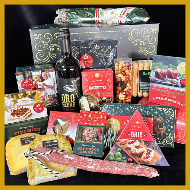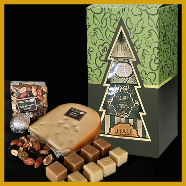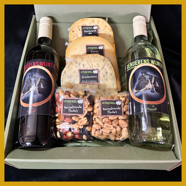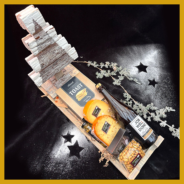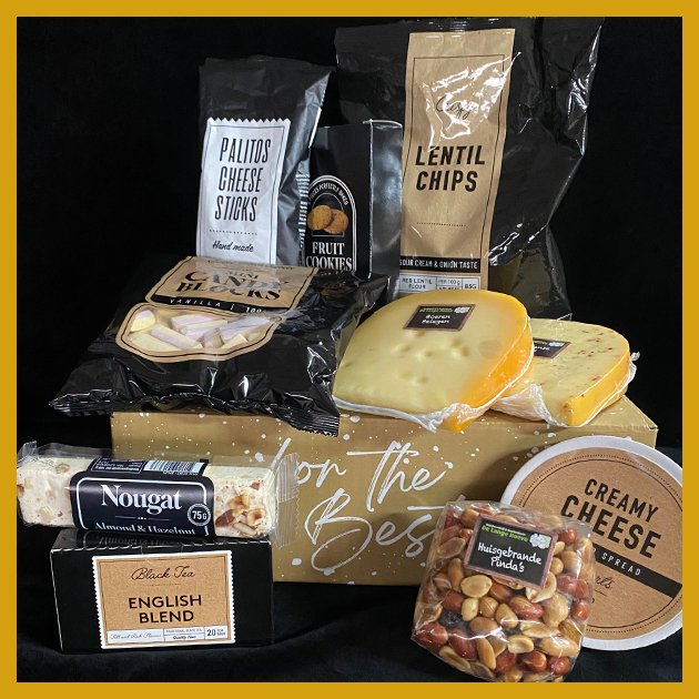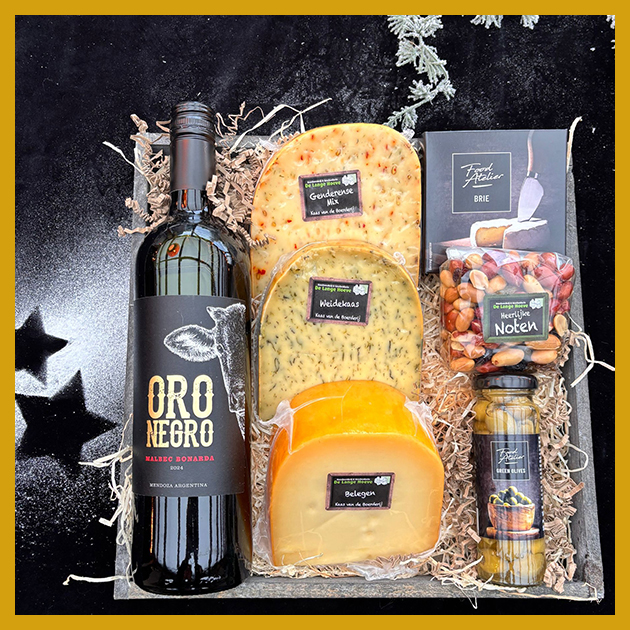 Inhoud: pakket met o.a. 3 stukken boerderijkaas, 2 pakjes met noten en heerlijke kaasdipper.